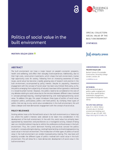 The built environment can have a major impact on people’s economic prospects, health and wellbeing, and affect their everyday lived experiences. Additionally, due to their high costs, construction investments, which shape the built environment, involve high opportunity costs for society. Following from an increasing awareness of these issues, social value has become a rapidly growing area of research and practice in the built environment, accompanied by policy interest. Despite its popularity, theoretical engagement with the concept of ‘social value’ has been very limited. Particularly, so far, the politics emerging from subjectivity of value(s) have been either ignored or mentioned in a broad-brushed manner. However, the politics need to be considered at the core of any debates relating to social value due to the tensions between different views involved in conceptualising/analysing, creating/implementing and realising/experiencing social value. To address this gap, this paper introduces three types of politics of social value: analytical politics, participatory politics and lived politics. By clarifying these types of politics that are key to any social value consideration in the built environment, this will allow a deeper and more democratic engagement with the concept of social value.