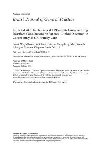 Title: | Impact of ACE Inhibitors and ARBs-related Adverse Drug Reactions Consultations on Patients’ Clinical Outcomes: A Cohort Study in UK Primary Care |