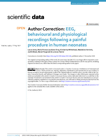 Title: | Author Correction: EEG, behavioural and physiological recordings following a painful procedure in human neonates |