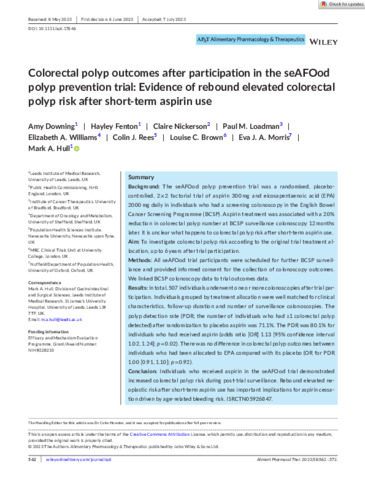 | Title: | Colorectal polyp outcomes after participation in the seAFOod polyp prevention trial: Evidence of rebound elevated colorectal polyp risk after short-term aspirin use |
