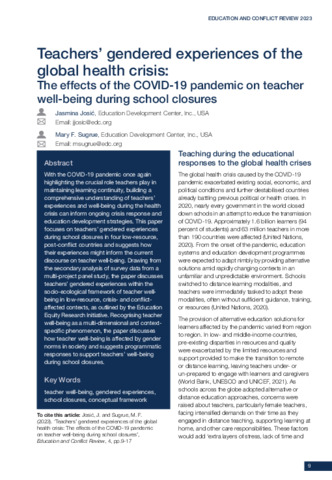 With the COVID-19 pandemic once again highlighting the crucial role teachers play in maintaining learning continuity, building a comprehensive understanding of teachers’ experiences and well-being during the health crisis can inform ongoing crisis response and education development strategies. This paper focuses on teachers’ gendered experiences during school closures in four low-resource, post-conflict countries and suggests how their experiences might inform the current discourse on teacher well-being. Drawing from the secondary analysis of survey data from a multi-project panel study, the paper discusses teachers’ gendered experiences within the socio-ecological framework of teacher well-being in low-resource, crisis- and conflict-affected contexts, as outlined by the Education Equity Research Initiative. Recognising teacher well-being as a multi-dimensional and context-specific phenomenon, the paper discusses how teacher well-being is affected by gender norms in society and suggests programmatic responses to support teachers’ well-being during school closures.