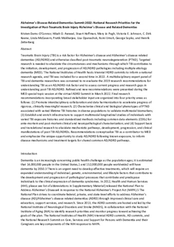 | Title: | Alzheimer's Disease-Related Dementias Summit 2022: National Research Priorities for the Investigation of Post-Traumatic Brain Injury Alzheimer's Disease and Related Dementias |