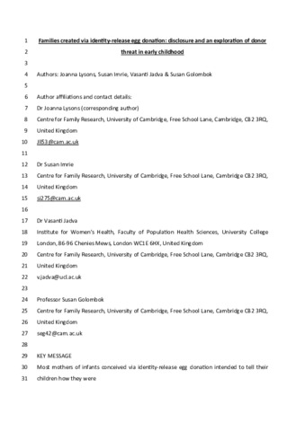 | Title: | Families created via identity-release egg donation: disclosure and an exploration of donor threat in early childhood |