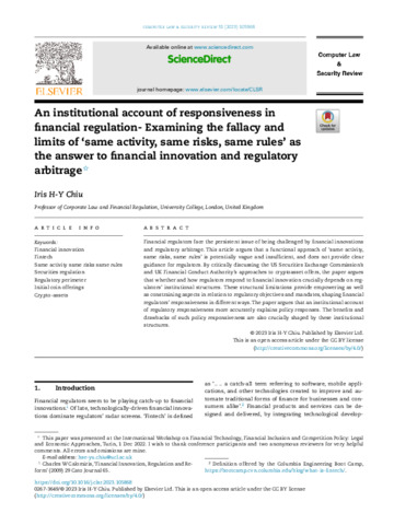 Title: | An Institutional Account of Responsiveness in Financial Regulation- Examining The Fallacy and Limits of ‘Same Activity, Same Risks, Same Rules’ as the Answer to Financial Innovation and Regulatory Arbitrage |
