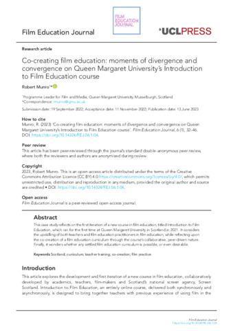 Title: | Co-creating film education: moments of divergence and convergence on Queen Margaret University’s Introduction to Film Education course |