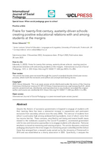 Title: | Freire for twenty-first-century, austerity-driven schools: creating positive educational relations with and among students at the margins |