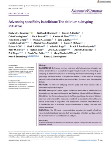 Zetterberg_Alzheimer s Dementia - 2023 - Bowman - Advancing specificity in delirium The delirium subtyping initiative.pdf Download (706kB) | Preview |