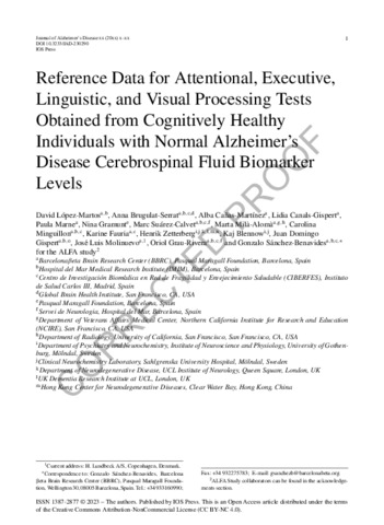 | Title: | Reference Data for Attentional, Executive, Linguistic, and Visual Processing Tests Obtained from Cognitively Healthy Individuals with Normal Alzheimer's Disease Cerebrospinal Fluid Biomarker Levels |