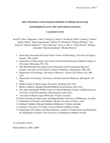 Role of biomarkers and emerging technologies in defining and assessing neurobiological recovery after sport-related concussion: a systematic review.