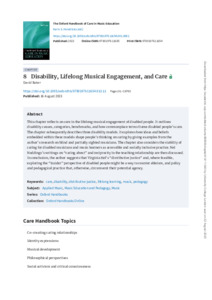 This chapter reflects on care in the lifelong musical engagement of disabled people. It outlines disability causes, categories, benchmarks, and how commonplace terms frame disabled people’s care. The chapter subsequently describes three disability models. It explores how ideas and beliefs embedded within these models shape people’s thinking on caring by giving examples from the author’s research on blind and partially sighted musicians. The chapter also considers the viability of caring for disabled musicians and music learners as accessible and socially inclusive practice. Nel Noddings’s writings on “caring about” and reciprocity in the teaching relationship are then discussed. In conclusion, the author suggests that Virginia Hel’s “distributive justice” and, where feasible, exploring the “insider” perspective of disabled people might be a way to counter ableism, and policy and pedagogical practice that, otherwise, circumvent their potential agency.
