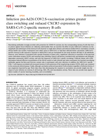 Title: | Infection pre-Ad26.COV2.S-vaccination primes greater class switching and reduced CXCR5 expression by SARS-CoV-2-specific memory B cells |