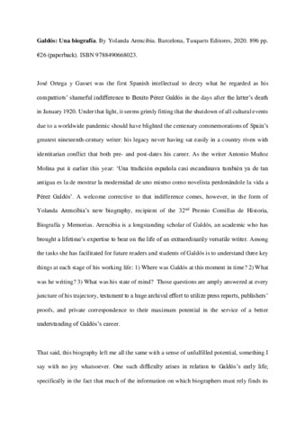 Title: | Galdós: Una biografía. By Yolanda Arencibia. Barcelona: Tusquets Editores, 2020. Pp. 896. €26 (paperback). ISBN 9788490668023 |