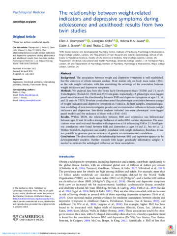 Title: | The relationship between weight-related indicators and depressive symptoms during adolescence and adulthood: results from two twin studies |