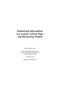In this dissertation, I argue that the friction between conceptual art and feminism was a generative site of artistic intervention in American art of the 1970s. I do this by examining the work of three New York-based artists who had a conflicted relation to both movements: Lee Lozano, Adrian Piper and Howardena Pindell. I situate these artists’ practices at a historical turning point, when the anti-war and liberation movements of the late 1960s and early 1970s rendered conceptual art’s fascination with abstract structures of communication increasingly suspect. Drawing on feminist science and technology studies, I show how these artists pushed against the ideology of dematerialisation that underpinned the information paradigm, and explored the sexual and racial politics that the erasure of the body disavowed. I contend that their attempts to embody information led them to develop socially situated practices, which often addressed their own positionality in the art world of the time. Rather than simply affirming the particularity of their own gendered and/or racialised bodies, however, I suggest that they explored the interplay between the schematic and the particular, abstraction and materiality, to challenge the conditions of legibility of their work. In so doing, they developed critical approaches to the institution of art that bound the interrogation of art’s conditions of production to an examination of the social structures of identity that curtailed their agency as artists. Looking at their practices through the lens of contemporary theories of feminist refusal, I consider the different strategies that they deployed to defy institutional structures, as well as to create new contexts for their work.