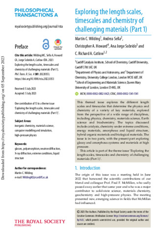 This themed issue explores the different length scales and timescales that determine the physics and chemistry of a variety of key materials, explored from the perspective of a wide range of disciplines, including physics, chemistry, materials science, Earth science and biochemistry. The topics discussed include catalysis, chemistry under extreme conditions, energy materials, amorphous and liquid structure, hybrid organic materials and biological materials. The issue is in two parts, with the present part exploring glassy and amorphous systems and materials at high pressure. This article is part of the theme issue 'Exploring the length scales, timescales and chemistry of challenging materials (Part 1)'.