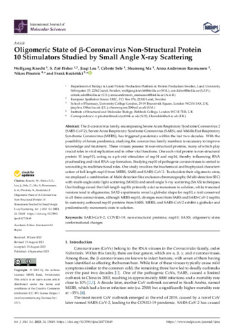Title: | Oligomeric State of β-Coronavirus Non-Structural Protein 10 Stimulators Studied by Small Angle X-ray Scattering |