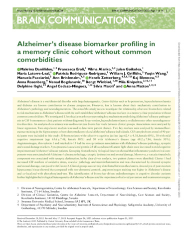 | Title: | Alzheimer's disease biomarker profiling in a memory clinic cohort without common comorbidities |