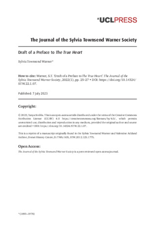 Warner’s draft of a preface to her novel The True Heart probably dates from the mid-1960s. It includes details about the background and composition of the novel that were not included in the shorter version of this piece that appeared as the preface to the 1978 Virago Press edition of the book.