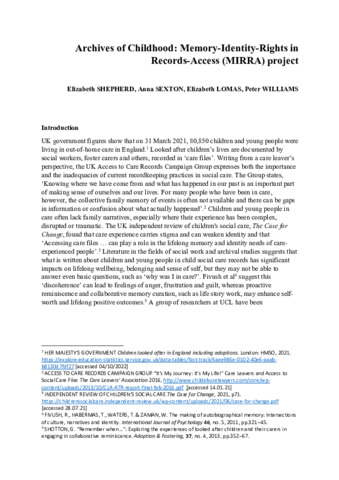 Shepherd_Archives of Childhood- Memory-Identity-Rights in Records-Access (MIRRA) project.pdf Download (255kB) | Preview |