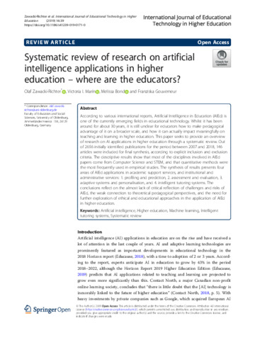 Zawacki-Richter et al (2019) - Systematic review of research on AI applications in HE.pdf - Published Version Download (893kB) | Preview |