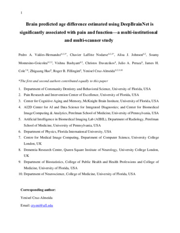 Title: | Brain-predicted age difference estimated using DeepBrainNet is significantly associated with pain and function—a multi-institutional and multiscanner study |