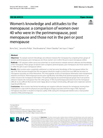 Title: | Women’s knowledge and attitudes to the menopause: a comparison of women over 40 who were in the perimenopause, post menopause and those not in the peri or post menopause |