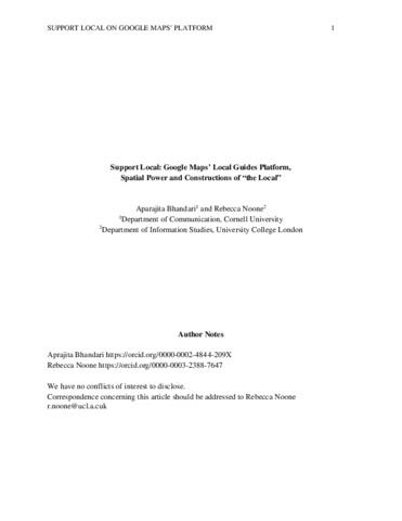 Title: | Support local: Google Maps' local guides platform, spatial power and constructions of "the local" |