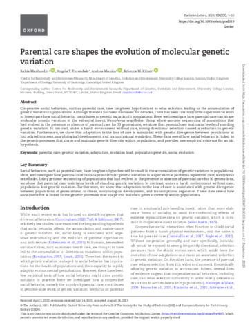Keywords: | parental care, genetic variation, adaptation, mutation load, population genetics, social evolution |