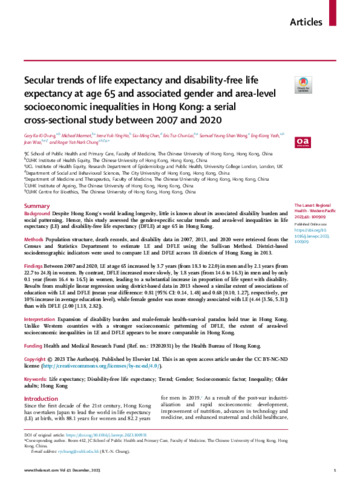 Secular trends of life expectancy and disability-free life expectancy at age 65 and associated gender and area-level socioeconomic inequalities in Hong Kong: a serial cross-sectional study between 2007 and 2020.