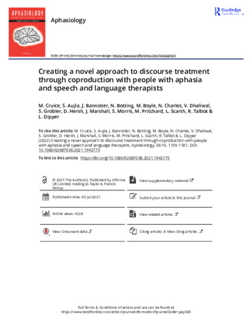 Title: | Creating a novel approach to discourse treatment through coproduction with people with aphasia and speech and language therapists |