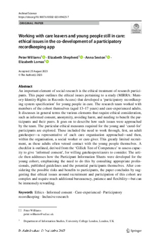 | Title: | Working with care leavers and young people still in care: ethical issues in the co-development of a participatory recordkeeping app |