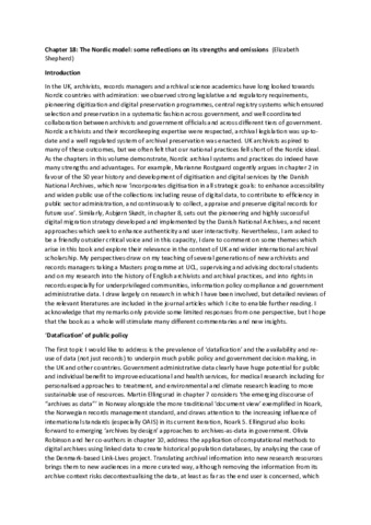 U.K. archivists, records managers, and archival science academics have long looked towards Nordic record keeping and sometimes felt that U.K. national practices fell short of the Nordic ideal. The Nordic model demonstrates strong up-to-date legislative and regulatory requirements, pioneering digitisation and digital archival preservation programmes, and enduring central registry systems across government, alongside the expertise of Nordic archivists and record keepers. This chapter reviews and comments on themes which arise in this book and explores their relevance in the context of the United Kingdom and wider international archival scholarship. Four main topics are covered: the prevalence of datafication and the availability and reuse of data (not just records) to underpin much public policy and government decision making; participatory and human-centred approaches to record keeping with special consideration of those whose lived experience is reflected in records; the continuing dominance of a centralised and government determined Nordic model in an era when greater decentralisation and sharing of digital sources across cultural institutions is emerging; and the demands these changes make on the skills and understanding of those managing data and digital futures, with implications for university education for archivists and other ways to bring digital skills into record keeping roles.