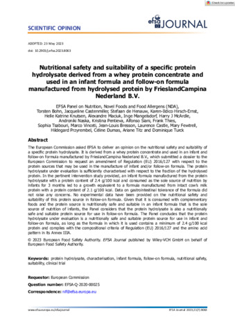 Nutritional safety and suitability of a specific protein hydrolysate derived from a whey protein concentrate and used in an infant formula and follow-on formula manufactured from hydrolysed protein by FrieslandCampina Nederland BV.
