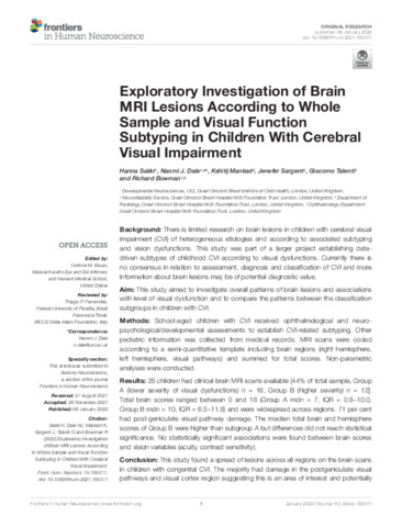 Dale_Exploratory Investigation of Brain MRI Lesions According to Whole Sample and Visual Function Subtyping in Children With Cerebral Visual Impairment_VoR.pdf - Published Version Download (566kB) | Preview |