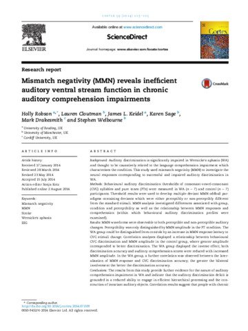 Mismatch negativity (MMN) reveals inefficient auditory ventral stream function in chronic auditory comprehension impairments.