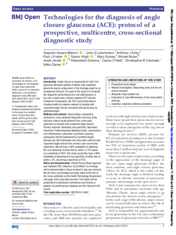 Title: | Technologies for the diagnosis of angle closure glaucoma (ACE): protocol of a prospective, multicentre, cross-sectional diagnostic study |