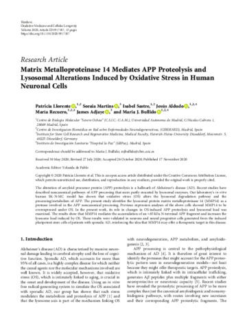 Matrix Metalloproteinase 14 Mediates APP Proteolysis and Lysosomal Alterations Induced by Oxidative Stress in Human Neuronal Cells.