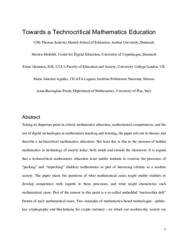 Taking its departure point in critical mathematics education, mathematical competencies, and the use of digital technologies in mathematics teaching and learning, the paper sets out to discuss and describe a technocritical mathematics education. Not least this is due to the increase of hidden mathematics in technology of society today, both inside and outside the classroom. It is argued that a technocritical mathe-matics education must enable students to exercise the processes of ”packing” and ”unpacking” (hidden) mathematics as part of becoming citizens in a modern society. The paper raises the questions of what mathematical cases might enable students to develop competence with regard to these processes, and what might characterise such mathematical cases. Part of the answer to this point is a so-called embedded ”matryoshka doll” feature of such mathematical cases. Two examples of mathematics-based technologies – public-key cryptography and blockchains for cryptocurrency – on which our modern-day society are deeply dependant are displayed and discussed in the light of a technocritical mathematics education.