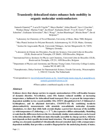 Title: | Transiently delocalized states enhance hole mobility in organic molecular semiconductors |