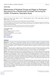 Title: | Effectiveness of Facebook Groups and Pages on Participant Recruitment Into a Randomized Controlled Trial During the COVID-19 Pandemic: Descriptive Study |