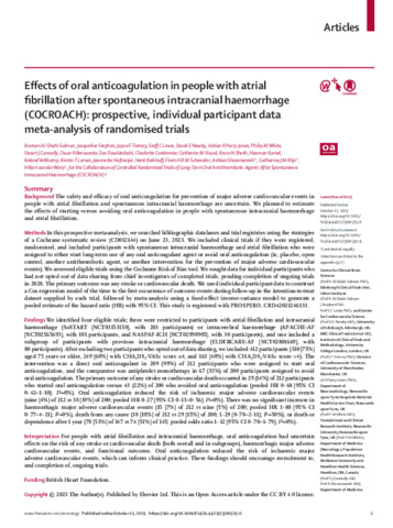 | Title: | Effects of oral anticoagulation in people with atrial fibrillation after spontaneous intracranial haemorrhage (COCROACH): prospective, individual participant data meta-analysis of randomised trials |