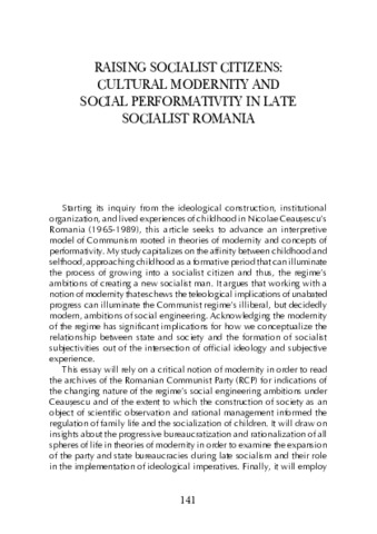 Starting its inquiry from the ideological construction, institutional organization, and lived experiences of childhood in Nicolae Ceauşescu’s Romania (1965-1989), this article seeks to advance an interpretive model of Communism rooted in theories of modernity and concepts of performativity. My study capitalizes on the affinity between childhood and selfhood, approaching childhood as a formative period that can illuminate the process of growing into a socialist citizen and thus, the regime’s ambitions of creating a new socialist man. It argues that working with a notion of modernity that eschews the teleological implications of unabated progress can illuminate the Communist regime’s illiberal, but decidedly modern, ambitions of social engineering. Acknowledging the modernity of the regime has significant implications for how we conceptualize the relationship between state and society and the formation of socialist subjectivities out of the intersection of official ideology and subjective experience.