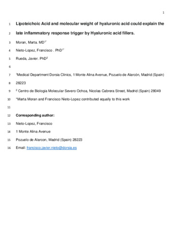 | Title: | Lipoteichoic acid and molecular weight of hyaluronic acid could explain the late inflammatory response trigger by hyaluronic acid fillers |