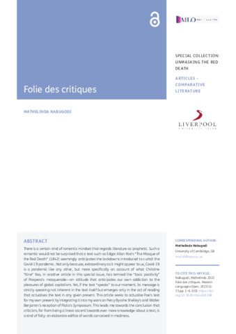 There is a certain kind of romantic mindset that regards literature as prophetic. Such a romantic would not be surprised that a text such as Edgar Allan Poe’s “The Masque of the Red Death” (1842) seemingly anticipates the lockdowns introduced to curtail the Covid-19 pandemic. Not only because, extraordinary as it might appear to us, Covid-19 is a pandemic like any other, but more specifically on account of what Christine “Xine” Yao, in another article in this special issue, has termed the “toxic positivity” of Prospero’s masquerade—an attitude that anticipates our own addiction to the pleasures of global capitalism. Yet, if the text “speaks” to our moment, its message is strictly speaking not inherent in the text itself but emerges only in the act of reading that actualises the text in any given present. This article seeks to actualise Poe’s text for my own present by integrating it into my work on Percy Bysshe Shelley’s and Walter Benjamin’s reception of Plato’s Symposium. This leads me towards the conclusion that criticism, far from being a linear ascent towards ever more knowledge about a text, is a kind of folly: an elaborate edifice of words conceived in madness.