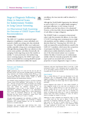 The SARS-CoV-2 pandemic necessitated urgent adaptation of guidelines to ensure individuals were exposed to health care settings only when absolutely necessary. This included the follow-up of pulmonary nodules, especially in lung cancer screening participants. Although delaying imaging follow-up evaluation in this context seems prudent, such delays theoretically risk upstaging of early-stage lung cancers that manifest as nodules. To assist practitioners who facilitate lung cancer screening programs, the CHEST expert panel report recommended that screening should be paused and that, for indeterminate nodules that require surveillance, the time intervals could be relaxed by 3-6 months.// Although the World Health Organization has declared an end to SARS-CoV-2 as a global health emergency, participant adherence to strict timing of interval surveillance scans has been shown to be suboptimal. However, at this time, little is known regarding the effect of such delays on stage at diagnosis.// The SUMMIT Study is a prospective observational cohort study that examines the delivery of a low-dose CT (LDCT) scan lung cancer screening service to a high-risk population and that validates a multicancer early detection blood test. Running from 2019-2023, the study was impacted by national lockdowns caused by the SARS-CoV-2 pandemic, which means that a proportion of participants had delays to interval scans for indeterminate nodules identified on baseline LDCT. The aim of this observational analysis was to examine whether the delay of interval scans for indeterminate nodules within the timescale proposed by the CHEST expert panel was associated with an increased proportion of cancers diagnosed at stage 2 or above.