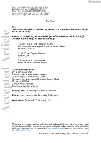 Outcomes of unilateral Pallidotomy in focal and hemidystonia cases.pdf - Accepted Version Download (1MB) | Preview |