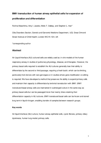 BMI1 Transduction of Human Airway Epithelial Cells for Expansion of Proliferation and Differentiation.