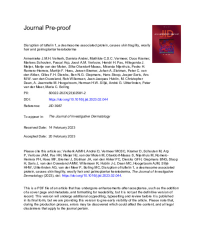 | Title: | Disruption of tuftelin 1, a desmosome associated protein, causes skin fragility, woolly hair and palmoplantar keratoderma |