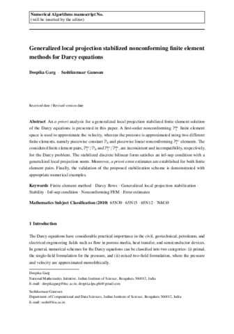 | Keywords: | Finite element method · Darcy flows · Generalized local projection stabilization · Stability · Inf-sup condition · Nonconforming FEM · Error estimates |