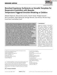 Title: | Branched Copolymer Surfactants as Versatile Templates for Responsive Emulsifiers with Bespoke Temperature-Triggered Emulsion-Breaking or Gelation |